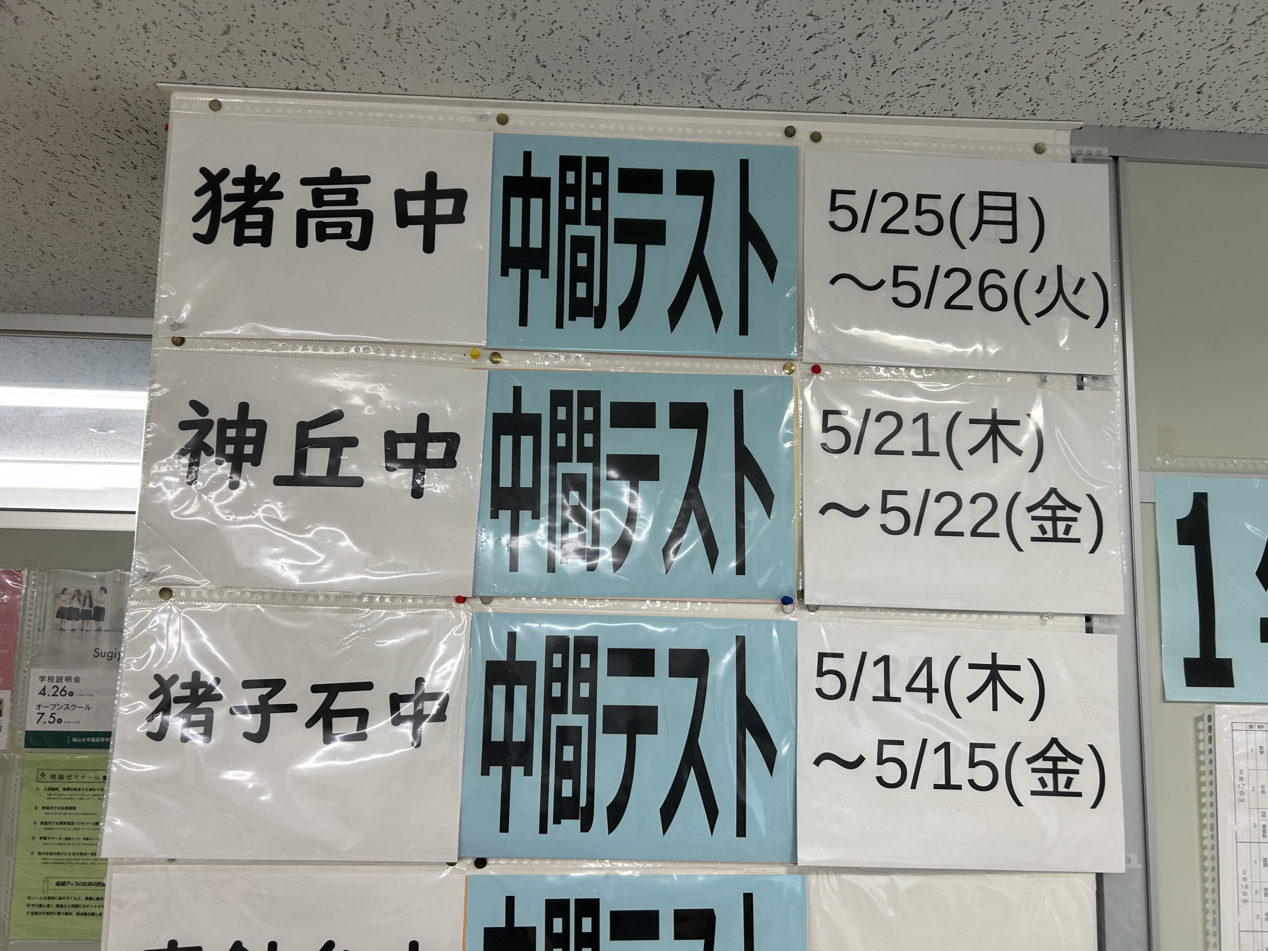 写真の通りやはりと言いますか、5月のテストの時期はバラバラになることがほとんどです。この他にも高針台中学校、香流中学校、上社中学校、東星中学校等があり塾としてはテスト対策の腕の見せ所といったところですね。