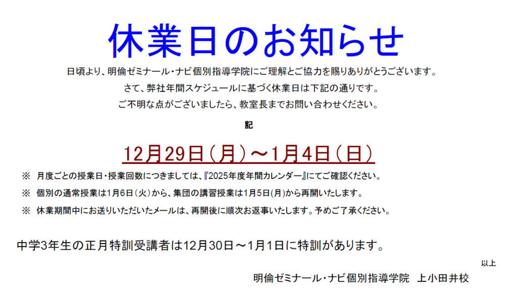 中学3年生で「正月特訓」にお申し込みされた方は、
