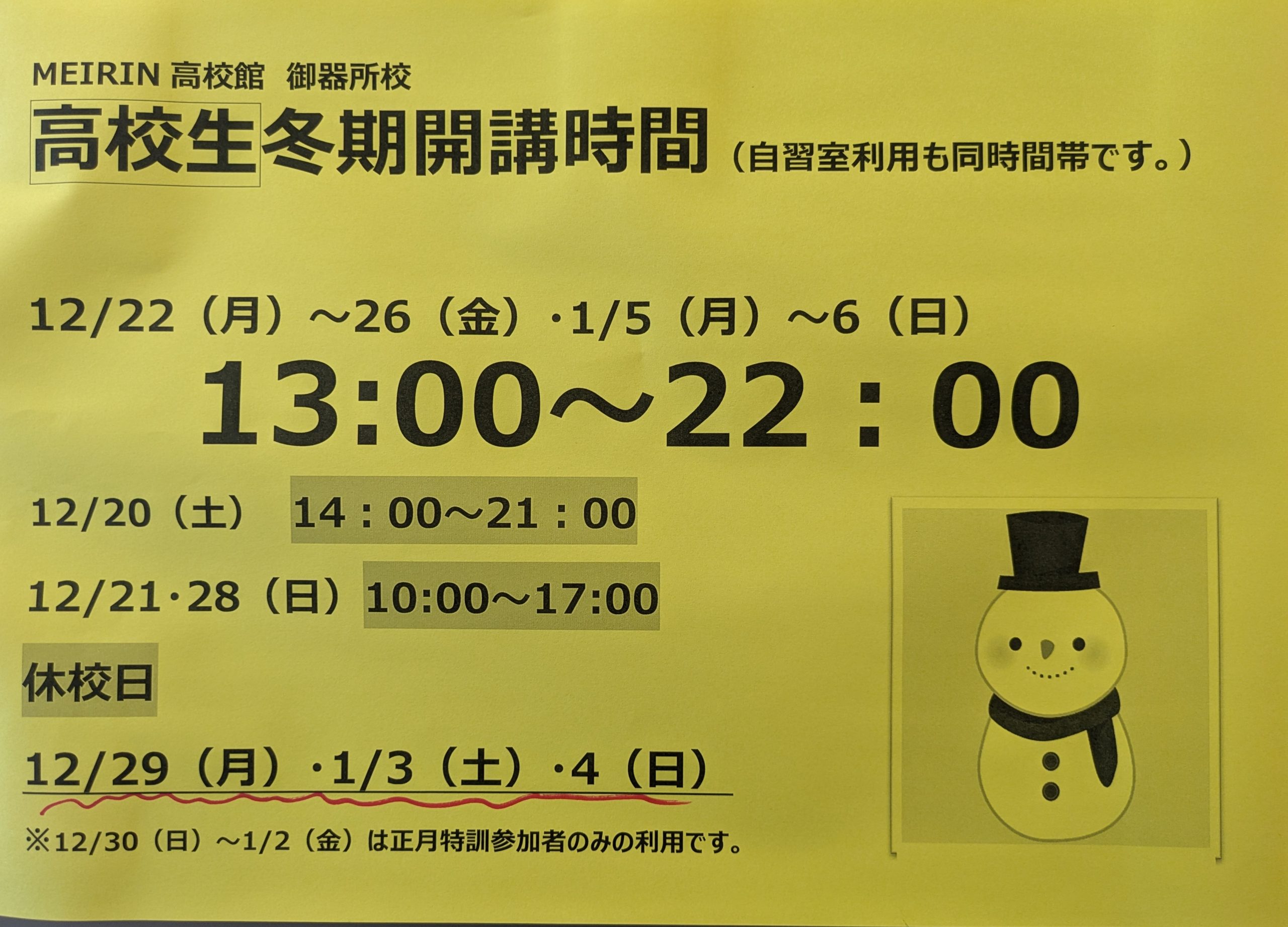 さて御器所高校館の冬期講習期間の開講時間をお知らせします。