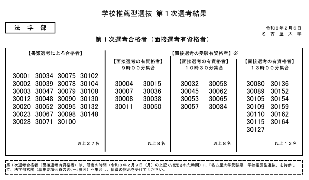 2/6名古屋大学の学校推薦型選抜1次発表がありました。