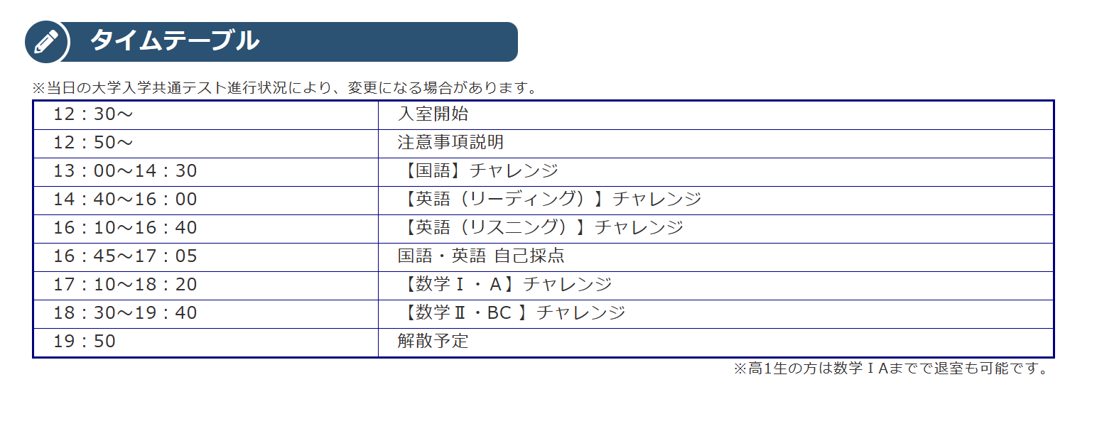 日時:2026年1月25日(日) 12:50~19:50(数ⅠAまでの受験の方は18:30頃)