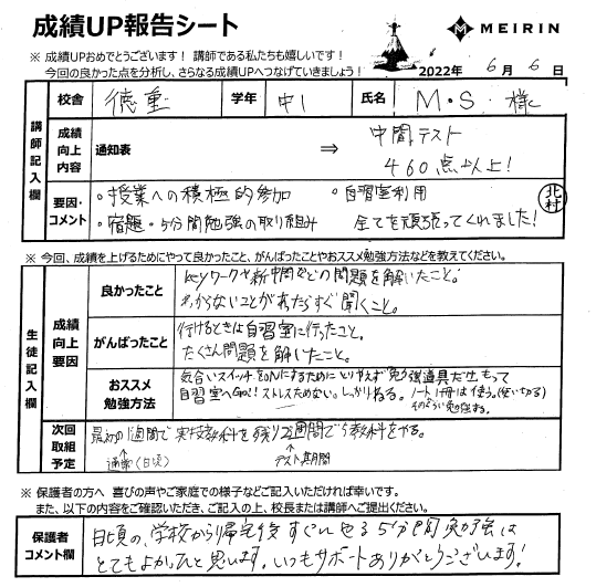 先日のブログにて、『徳重校の中間テスト結果』をお伝えしました。