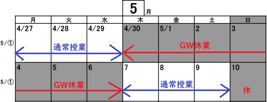 5月①週目の通常授業が、4/27(月) 4/28(火) 4/29(水祝) 5/7(木) 5/8(金) 5/9(土)となっており、