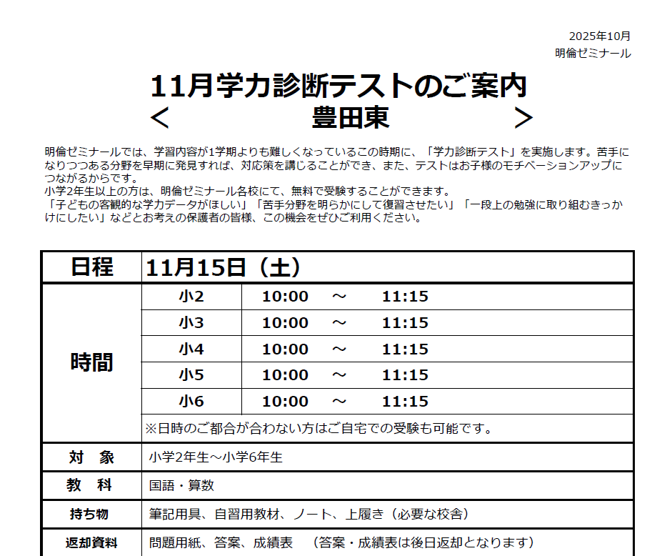 11月は塾生の学習状況を客観的に把握し、次の一歩につなげる「学力診断テスト」を実施します。